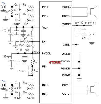 HT8698具有AB類和D類的切換功能,在受到D類功放EMI干擾困擾時,可隨時切換至AB類音頻功放模式。