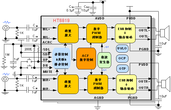 HT6819的防削頂失真功能可檢測并抑制由于音樂、語音信號幅度過大或電池電壓下降所引起的輸出削頂失真(破音),顯著提高音質,創造舒適的聽音享受,并保護揚聲器免受過載損壞。通過在ACRC端外接不同電阻電容值,可靈活設置放大器的音質和輸出功率;同時芯片提供了ACF Off模式。