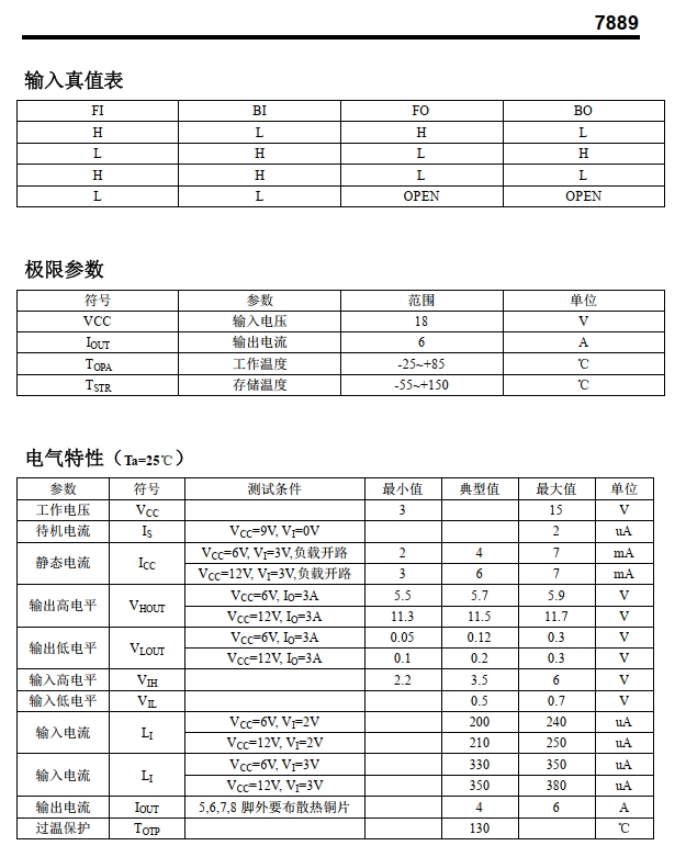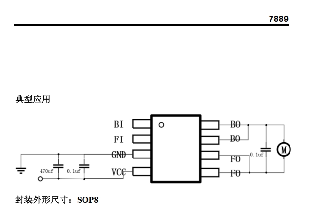 7889 是一款直流雙向電機驅動芯片,適用于玩具、自動閥門、電磁門鎖等電機驅動場合。該芯片有兩個邏輯輸入端子用來控制電機前進、后退及制動。具有良好的抗干擾性,微小的待機電流、低的輸出內阻,同時內部集成二極管可迅速釋放感性負載的反向沖擊電流。