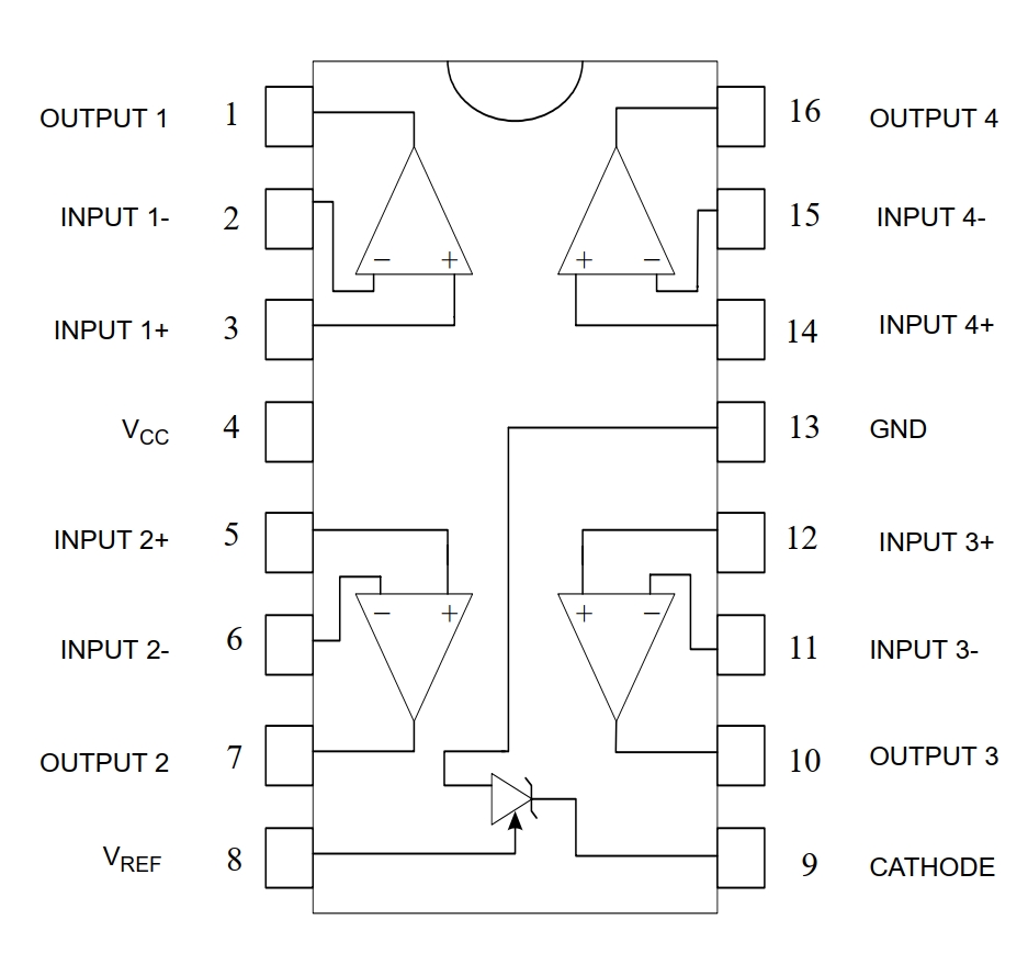 The AP4303 is a monolithic IC that contains quad operational amplifiers and a precision shunt regulator,1.25Vfor AP4303-C or 1.24V for AP4303-D respectively. It is specifically designed to regulate the output current and voltage levels of switching battery chargers and power supplies.