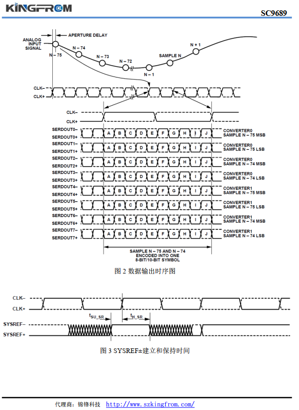 SC9689 利用 ADC 的寄存器中的快速檢測控制位,可編程閾值檢測器可以監(jiān)控輸入信號功率。如果輸入信號電平超過可編程閾值,快速檢測指示器就會變?yōu)楦唠娖健S捎谠撻撝抵甘酒鞯难舆t極短,因此用戶能夠快速調(diào)低系統(tǒng)增益,從而避免 ADC 輸入端出現(xiàn)超量程現(xiàn)象。除了快速檢測輸出外, SC9689 還具有信號監(jiān)控能力。信號監(jiān)控模塊可提供 ADC 進(jìn)行數(shù)字化處理信號的其它信息。用戶可將 JESD204B 子類 1 的高速串行輸出設(shè)置為各種單通道、雙通道、四通道和八通道配置,具體取決于接收邏輯器件的可接受通道速率。 SYSREF±和 SYNCINB±輸入引腳支持多器件同步。