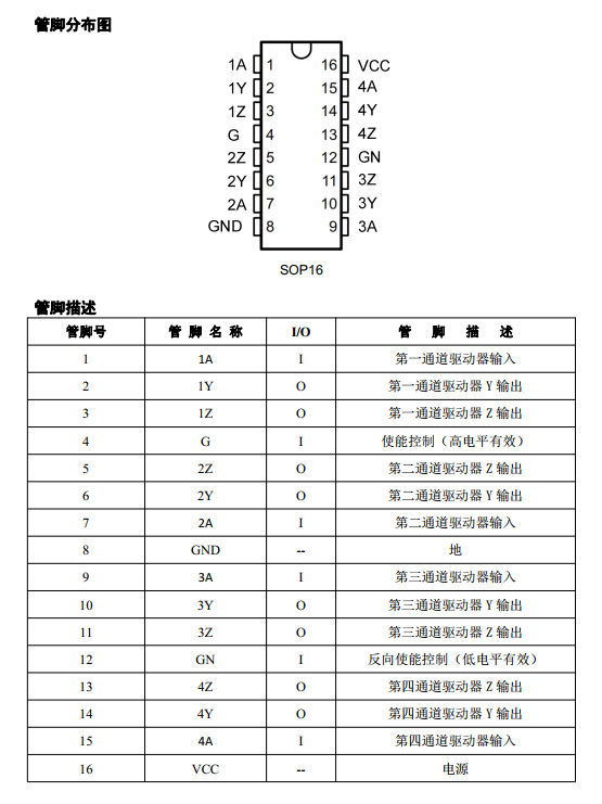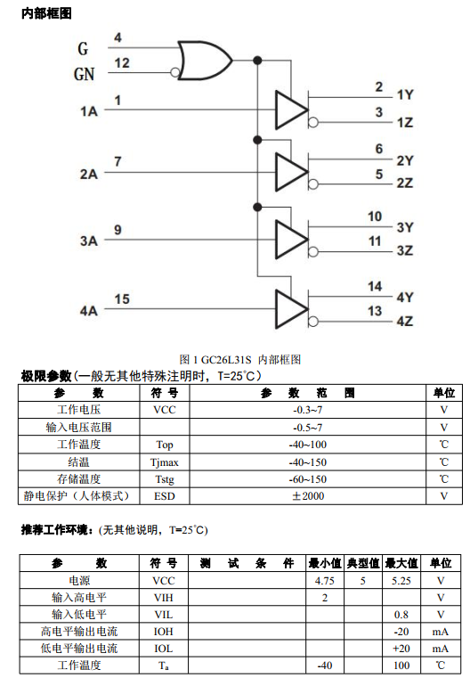 芯片描述GC26L31S 是一款低壓5V四通道差分線路驅(qū)動(dòng)芯片, 可滿足 ANSI TIA / EIA-422-B和 ITU V.11 的要求。 高電流能力的三態(tài)輸出可驅(qū)動(dòng)平衡雙絞線或并行傳輸線, 在斷電模式下, 輸出處于高阻抗?fàn)顟B(tài)。 G 和 GN 可同時(shí)控制四路驅(qū)動(dòng)器。 在不犧牲速度的情況下低功耗肖特基電路可降低功耗。GC26L31S 是 SOP16 封裝。
