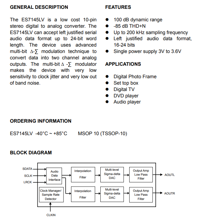 順芯ES7145LV 24位雙路音頻DAC 立體聲DAC芯片,可以接受左對齊串行音頻數據格式,最長可達24位字長