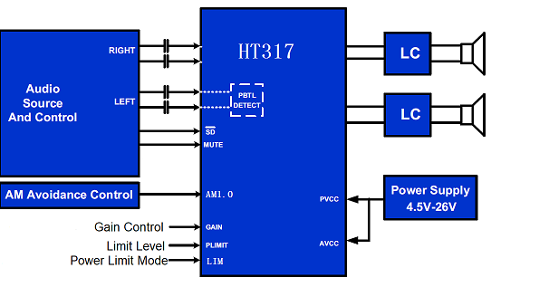 HT317具有豐富的功率限制功能,以滿足各類應(yīng)用。一種是限幅功能(PLIMT),即在輸出端限制其最大輸出擺幅低于設(shè)定值,可避免意外的超額輸出功率損壞喇叭。另一種為自動增益控制功能(AGC),開啟后,可有效改善因輸入幅度過大或者電源電壓降低造成的破音失真。