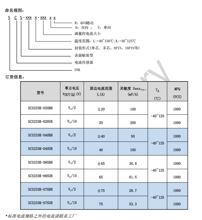 森尼克SCS233K系列電流傳感器各型號:SCS233K-020BR,SCS233K-020UR,SCS233K-040BR,SCS233K-040UR,SCS233K-065BR,SCS233K-065UR,SCS233K-075BR,SCS233K-075UR 對標替代美國Allegro電流傳感器有ACS732KLATR系列和ACS732KMATR系列,pin to pin國產替代如下具體Allegro型號:ACS732KLATR-20AB-T,ACS732KLATR-40AB-T,ACS732KLATR-65AB-T,ACS732KLATR-65AU-T,ACS732KLATR-75AB-T,ACS732KMATR-65AB-T,ACS732KMATR-75AB-T