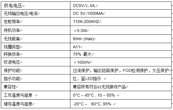 1.符合QI標準設(shè)計要求,兼容所有符合QI無線接收產(chǎn)品。
