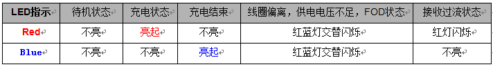 3.模塊充電結(jié)束時,模塊上藍色LED燈亮起 (此功能需要QI無線接收端反饋信號,如QI無線接收端無此反饋信號,模塊上藍色LED燈不會亮起。模塊將會長亮紅色LED燈)