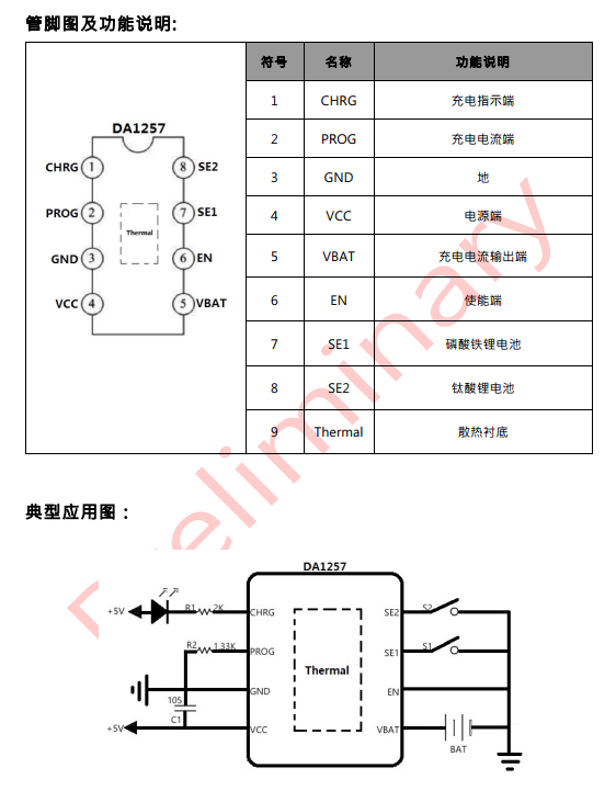 概述:DA1257 是一款完整的多模單節鋰離子電池充電器, 可對 3.7V 鋰電池, 3.2V 磷酸鐵鋰電池及 2.4V 鈦酸鋰電池充電, 充電器具有電池正負極反接保護,采用恒定電流/恒定電壓線性控制。 DA1257 可以適合 USB 電源和適配器電源工作。由于采用了內部 MOSFET 架構,加上防倒充電路,所以不需要外部檢測電阻器和隔離二極管。熱反饋可對充電電流進行自動調節,以便在大功率操作或高環境溫度條件下對芯片溫度加以限制。充滿電壓會因不同的鋰電池而不同,而充電電流可通過一個電阻器進行外部設置。當電池達到充滿電壓后,充電電流降至設定值 1/10, DA1257 將自動終止充電。 當輸入電壓(交流適配器或 USB 電源)被拿掉時, DA1257 自動進入一個低電流狀態,電池漏電流在 2uA 以下。 DA1257 的其他特點包括充電電流監控器、欠壓閉鎖、自動再充電和一個用于指示充電結束和輸入電壓接入的狀態引腳。