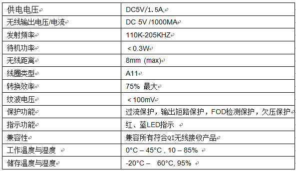 1.符合QI標準設計要求,兼容所有符合QI無線接收產品。