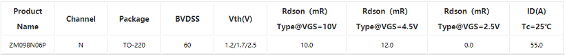 真茂佳ZM098N06P-TO-220 60V 10mΩ Vth1.7 N溝道電機驅動MOS管 真茂佳一級代理商 完全替代新潔能、后羿、銳駿,可用于筋膜槍,電機驅動,無線充,電子煙,鋰電保護,PD快充,DCDC車充等市場應用;