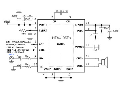 此外,HT8310內部固定28dB增益,內置的關斷功能使待機電流最小化,還集成了輸出端過流保護、片內過溫保護和電源欠壓異常保護等功能。
