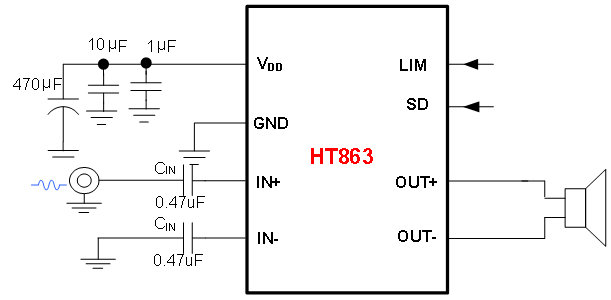 此外,HT863內部集成免濾波器調制技術,能夠直接驅動揚聲器,內置的關斷功能使待機電流最小化,還集成了輸出端過流保護、片內過溫保護和電源欠壓異常保護等功能。