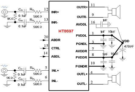 HT8697可實現AB類和D類的自由切換功能,在受到D類功放EMI干擾困擾時,可隨時切換至AB類音頻功放模式。