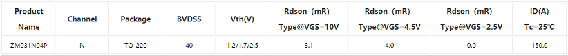 真茂佳ZM031N04P-TO-220 40V 3.1mΩ Vth1.7 N溝道電機驅(qū)動MOS管 真茂佳一級代理商 完全替代新潔能、后羿、銳駿,可用于筋膜槍,電機驅(qū)動,無線充,電子煙,鋰電保護,PD快充,DCDC車充等市場應用;
