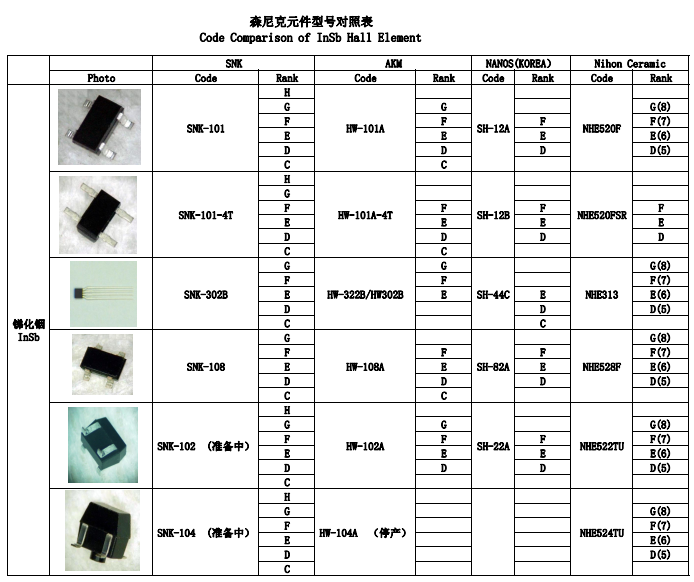 森尼克銻化銦InSb霍爾元件型號選型對照表