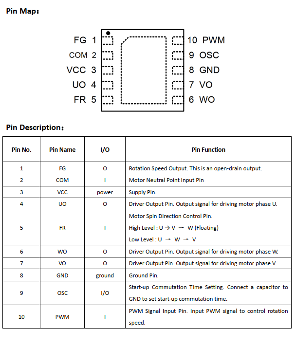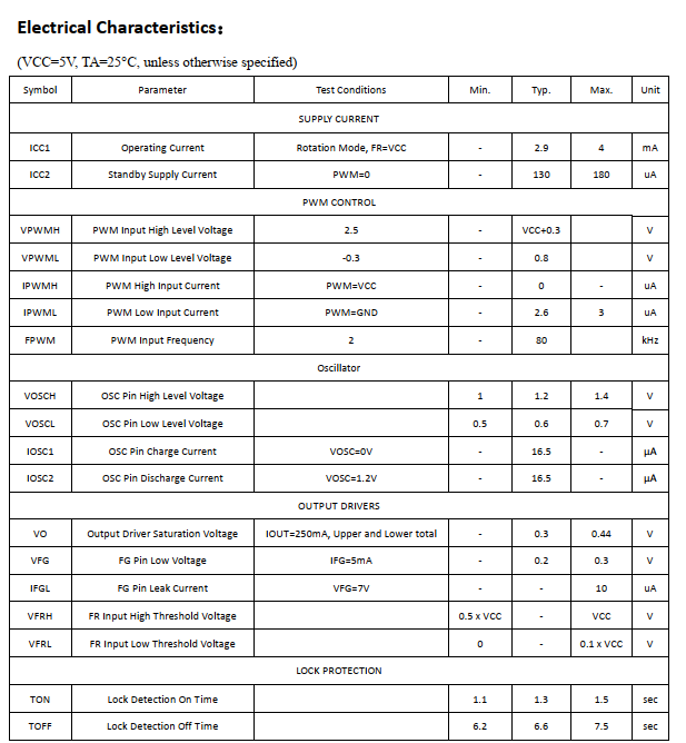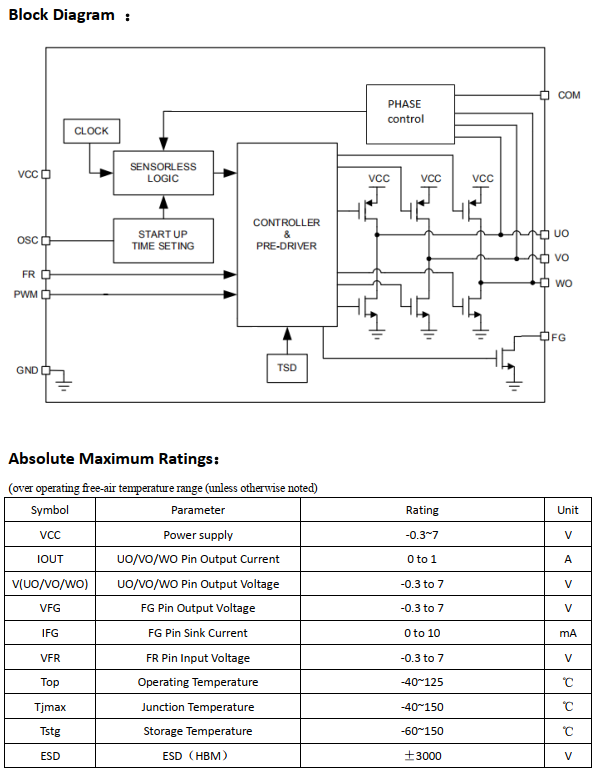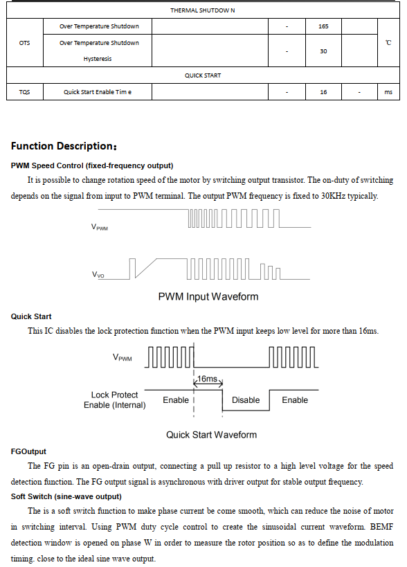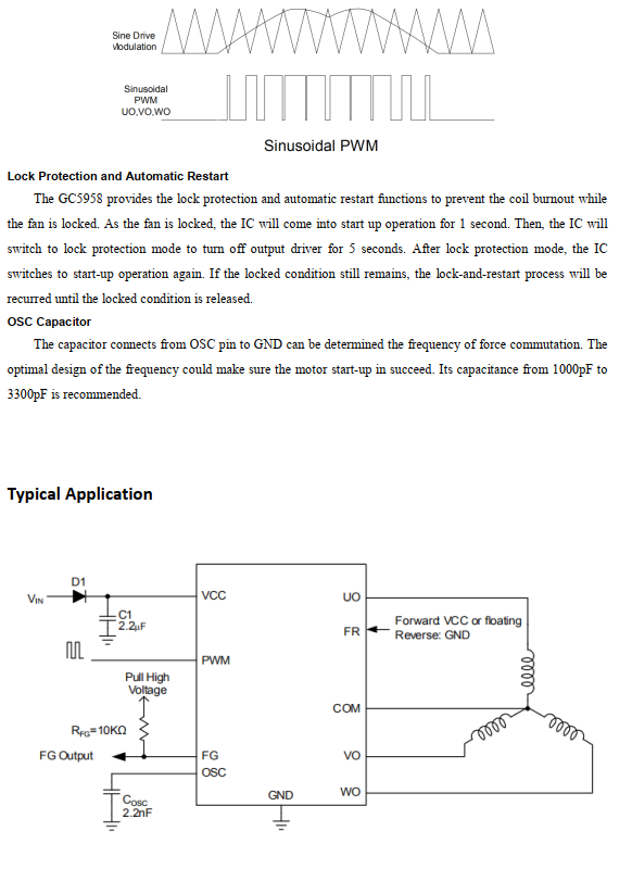 The GC5958 provides all the circuitry forsensor-less speed control of three-phase brushlessDC motor. The Sine-wave Driver Method will bebetter low-noise. The controller functions includestart-up circuit, back-EMF commutation control,Pulse Width Modulation (PWM) speed control,lock protection, and thermal shutdown circuit.