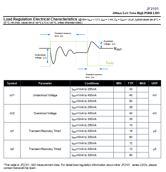 The JF2101 typically has 80mV dropout voltage at 400mA load current with VOUT=1.8V and chip enable function (EN) forlong battery life.
