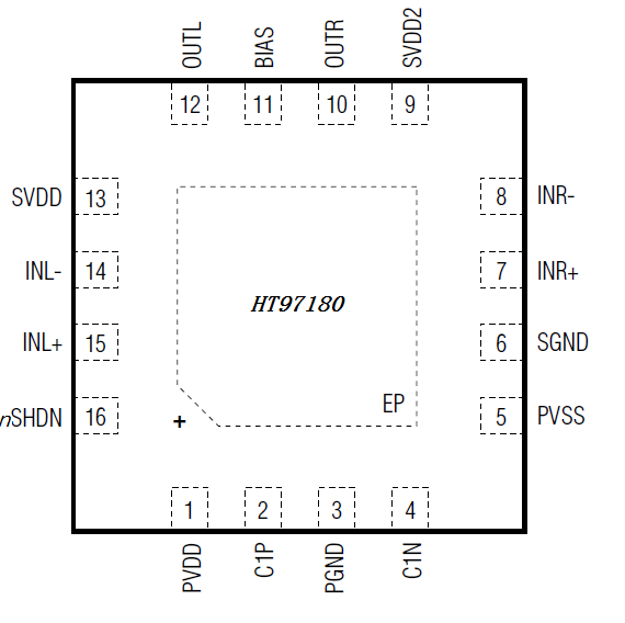 HT97180為差分輸入、可直接輸出的耳機放大器。4.2V供電時,器件為32Ω耳機負載提供125mW驅動。IC可以通過外部電阻調整增益。
