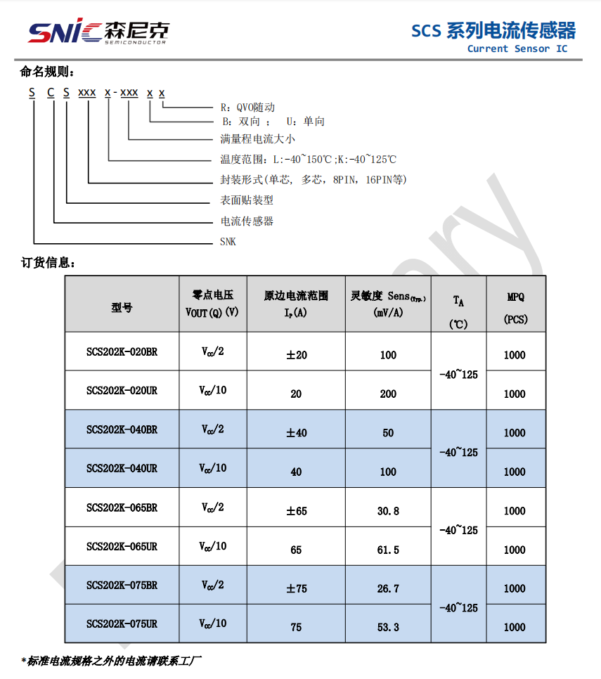 森尼克SCS202K系列電流傳感器各型號:SCS202K-020BR,SCS202K-020UR,SCS202K-040BR,SCS202K-040UR,SCS202K-065BR,SCS202K-065UR,SCS202K-075BR,SCS202K-075UR對標替代美國Allegro電流傳感器有ACS37002LMC系列,ACS37002KMA系列,ACS37002LLA系列,ACS37002LMA系列,pin to pin國產替代如下具體Allegro型號:ACS37002LMC系列: