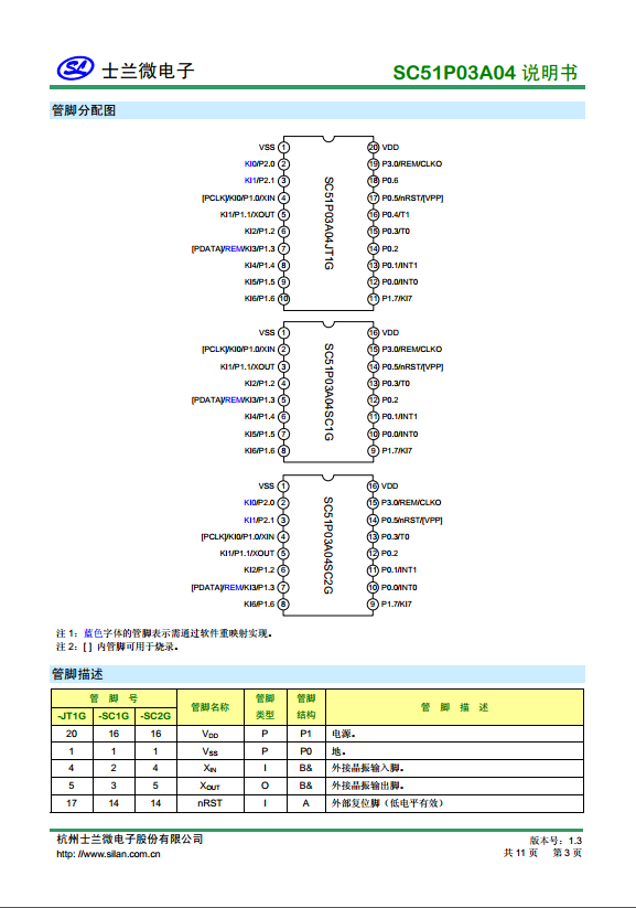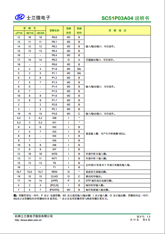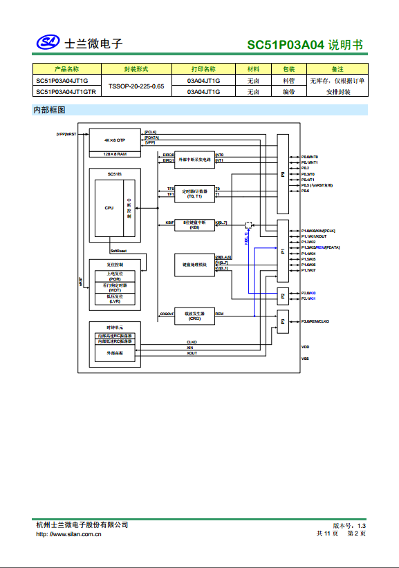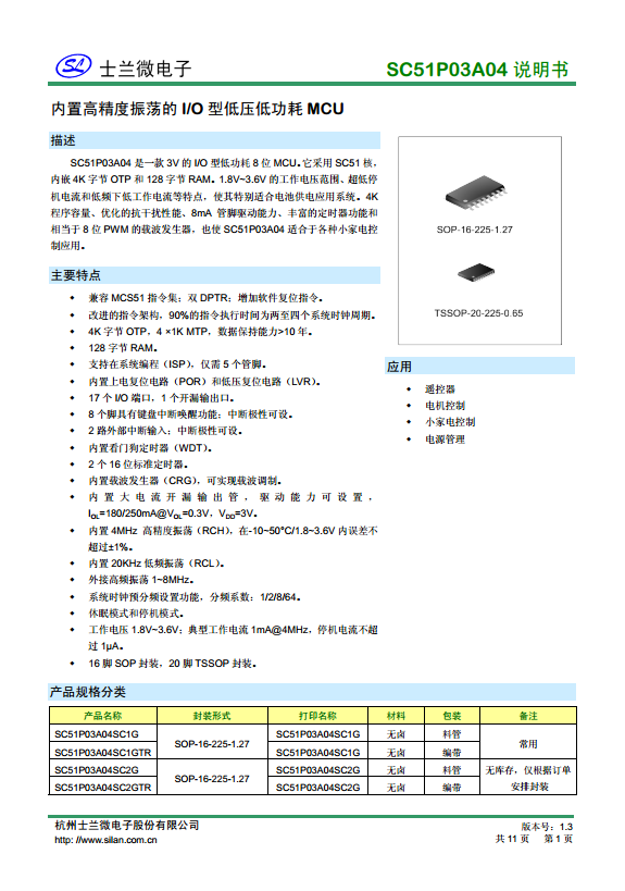 SC51P03A04 內(nèi)置高精度振蕩的I/O型4K字節(jié)OTP低壓低功耗MCU