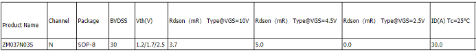 ZM037N03S SOP-8 30 ±20 1.2/1.6/2.5 3.7/5.5 5/6.5 - - 30