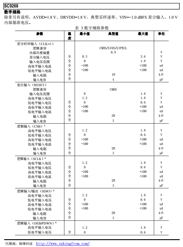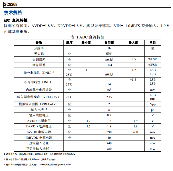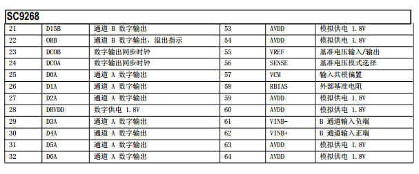 SC1269 是一款雙通道 16 位, 最高轉換速度 125MSps, 基于流水線架構的模數轉換器( ADC) , 內部集成了時鐘緩沖、 基準電壓源、輸入采樣保持等功能模塊, 實現對模擬輸入高速高精度模數轉換。 并集成了獨特的數字校準算法, 在不影響功耗的前提下, 有效提升ADC動態特性。 輸出為 1.8V 全并行 CMOS 電平,采用三線制 SPI 串行接口實現內部寄存器的讀寫操作。 SC9268 采用 64 腳 QFN 封裝, 額定溫度范圍-40℃ 至 85℃ 工業溫度范圍。