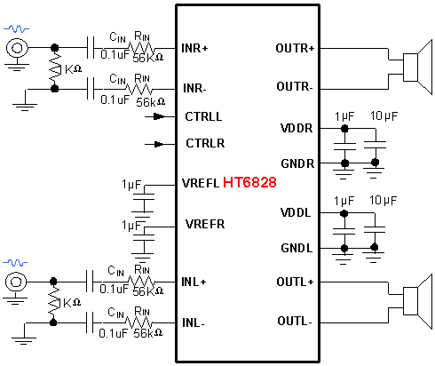 HT6828內部集成免濾波器數字調制技術,能夠直接驅動揚聲器,并最大程度減小脈沖輸出信號的失真和噪音。輸出無需濾波網絡,極少的外部元器件節省了系統空間和成本,是便攜式應用的理想選擇。