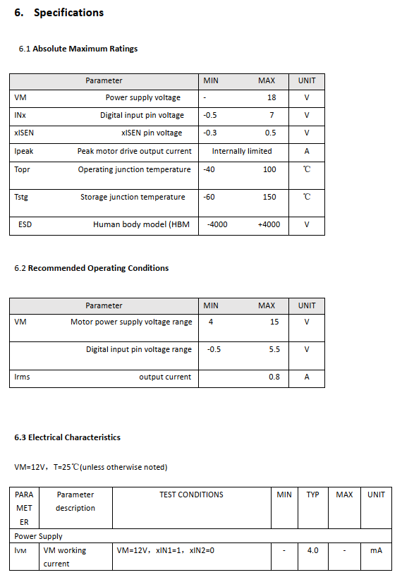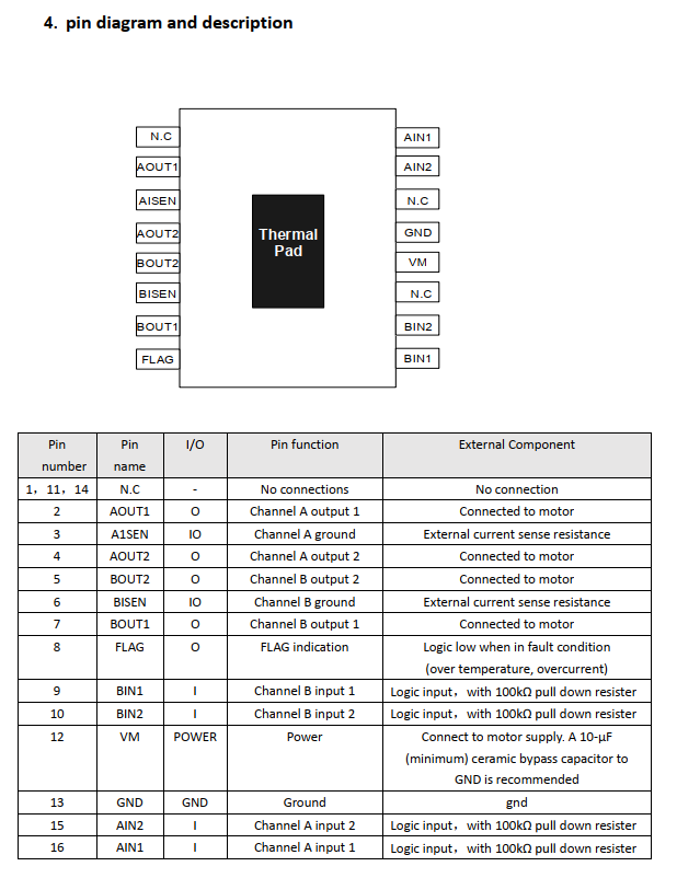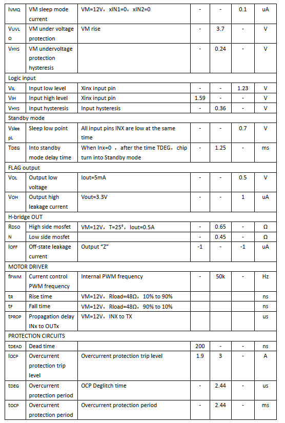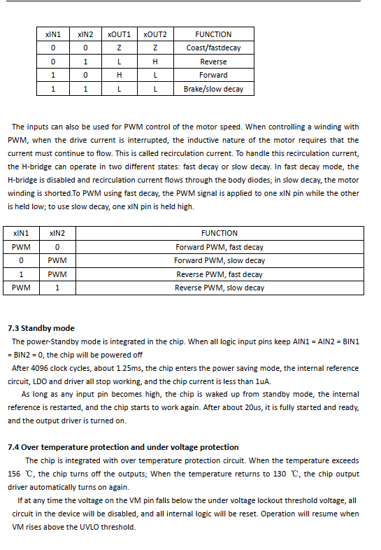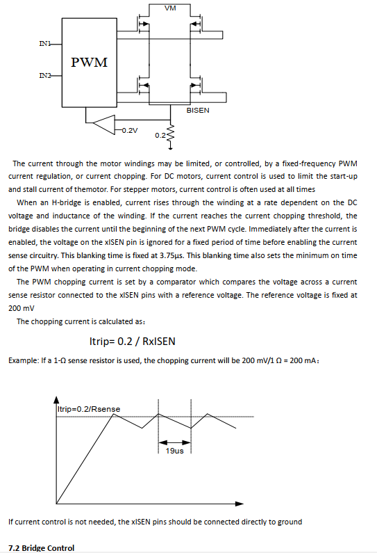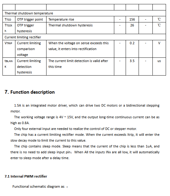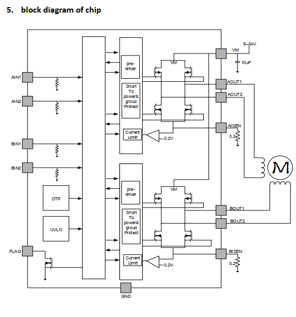 The output H-bridge of the chip integratescurrent limiting function, and each powerMOS transistor is provided with over-currentprotection and short-circuit protection.