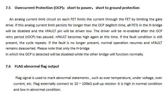 The chip has FLAG pin, when thetemperature is too high, the voltage is too low,or the output short circuit, the outputindication signal。