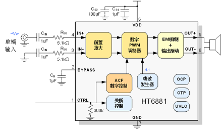 HT6881的最大特點是防削頂失真(ACF)輸出控制功能,可檢測并抑制由于輸入音樂、語音信號幅度過大所引起的輸出信號削頂失真(破音),也能自適應地防止在電池應用中由電源電壓下降所造成的輸出削頂,顯著提高音質,創造非常舒適的聽音享受,并保護揚聲器免受過載損壞。同時芯片具有ACF-Off 模式。