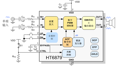 HT6879是一款高保真超低EMI的,內部集成32階數字音量控制且具有防削頂失真功能的單聲道免濾波D類音頻功率放大器。在5V電源,10% THD+N,4Ω負載條件下,輸出3.5W高功率,在各類音頻終端應用中維持高效率并提供AB類放大器高保真、低噪聲的性能。