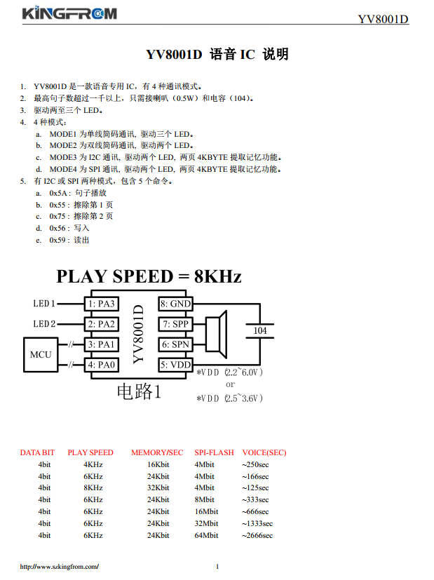 1. YV8001D是一款語音專用IC,有4種通訊模式。