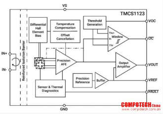 一體式封裝的霍爾效應(yīng)電流傳感器在高壓系統(tǒng)中很受歡迎,因?yàn)樗鼈兲峁┝嗽鰪?qiáng)型隔離或雙重隔離。不過(guò),霍爾效應(yīng)電流傳感器會(huì)在整個(gè)溫度和生命周期內(nèi)發(fā)生漂移,這一點(diǎn)讓它獲得的評(píng)價(jià)不高。TI 將 TMCS1123 的漂移誤差大幅降低至 ±0.5%。該器件具有差分霍爾效應(yīng)感應(yīng)功能,能夠顯著減少磁場(chǎng)干擾或串?dāng)_,并且還提供了過(guò)流檢測(cè)、精密電壓基準(zhǔn)和傳感器報(bào)警等其他功能;請(qǐng)參閱圖 3。使用一體式封裝解決方案時(shí),電流通過(guò)引線框在封裝內(nèi)流動(dòng),這會(huì)帶來(lái)引線框電阻和芯片散熱限制,進(jìn)而會(huì)限制器件能夠處理的電流大小。TMCS1123 器件產(chǎn)品系列能夠在 25°C 時(shí)測(cè)量 75Arms 的電流。