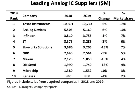 ICinsights指出,與2018年相比,TI的模擬銷售額下降了約6億美元,但其銷售額仍然是排名第十的瑞薩的十倍以上。數(shù)據(jù)顯示,TI 2019年的模擬收入占其IC銷售額128億美元的80%,占其半導(dǎo)體總收入137億美元的75%。