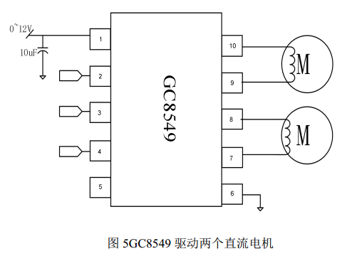 GC8549 是一款雙通道 12V 直流電機驅動芯片,為攝像機、消費類產品、玩具和其他低壓或者電池供電的運動控制類應用提供了集成的電機驅動解決方案。芯片一般用來驅動兩個直流電機或者驅動一個步進電機。GC8549 可以工作在 3.8~12V 的電源電壓上,每通道能提供高達 1.5A 持續輸出電流或者2.5A峰值電流,