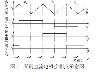 三相無刷直流電機常采用兩兩導通的方式工作,兩兩導通指任意時刻逆變器只有2只開關管開通。無刷直流電機需要根據轉子位置來切換工作狀態,也就是說換相點是無刷直流電機正常工作必不可少的信息。圖1為三相無刷直流電機換相點示意圖,為便于理解,特給出了反電勢以及相電流波形,圖中ea,eb,ec代表三相相反電勢,由圖可見,對于三相無刷直流電機,每個電周期內有6個不同的換相點,也就是說每個電周期內電機換相6次。