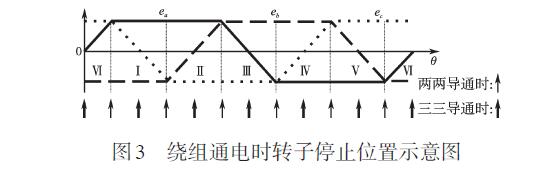 T =eaia + ebib + ecicω式中:ea ,eb ,ec 為三相相反電勢;ia ,ib ,ic 為三相相電流;ω 為電機角速度??蛰d時,在電機繞組中通以固定電流,電機轉子將轉到某一位置并停止,此時電機產生的轉矩零圖3中,Ⅰ~Ⅵ表示霍耳傳感器將電周期分成的6 個區域,當兩兩導通時,通電的兩相繞組電流大小相等,方相反,電機轉矩為零的點分布在各個區域的邊界上;當采用三三導通時,三相繞組均通電,若電流最大相的電流為I,那么其它兩相電流為-I/2,此時電機轉矩為零的點分布在各個區域的中間位置,如圖3 所示。通過以上分析可以知道,要使轉子轉到某一個區域,采用三三導通的方法要比兩兩導通的方法更加合理。