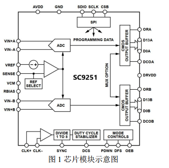 當需要轉換器充分發揮其全動態性能時,應禁用 SPI端口。通常 SCLK 信號、CSB 信號和SDIO信號與 ADC時鐘是異步的,因此,這些信號中的噪聲會降低轉換器性能。如果其它器件使用板上 SPI總線,則可能需要在該總線與 SC9251之間連接緩沖器,以防止這些信號在關鍵的采樣周期內,在轉換器的輸入端發生變化。