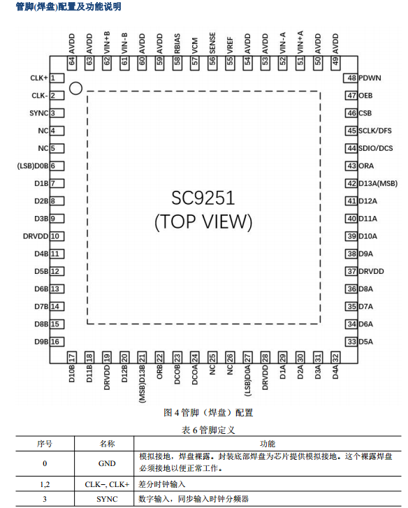 建議使用兩個獨立的電源為 SC9251 供電:一個用于模擬端 AVDD,一個用于數字輸出端DRVDD。對于 AVDD和 DRVDD,應使用多個不同的去耦電容以支持高頻和低頻。去耦電容應放置在接近 PCB 入口點和接近器件引腳的位置,并盡可能縮短走線長度。SC9251 僅需要一個PCB接地層。對 PCB模擬、數字和時鐘模塊進行合理的去耦和巧妙的分隔,可以輕松獲得最佳的性能。