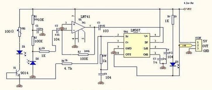 D1發射紅外線,D2接收紅外信號。LM567第⑤、⑥腳為譯碼中心頻率設定端,一般通過調整其外接可變電阻W改變捕捉的中心頻率。圖中紅外載波信號來自LM567的第5角,也即載波信號與捕捉中心頻率一致,能夠極大的提高抗干擾特性。