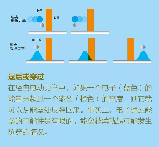 電子和空穴都遵守量子力學定律,這意味著它們的大小是模糊不定的。當能壘的厚度不到10納米時,一開始在能壘一側的電子就不太可能(但并非完全不可能)出現在另一側。