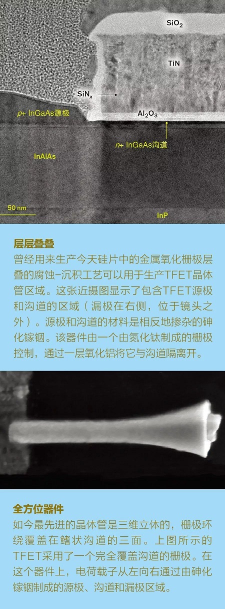 之后,賓州州立大學的團隊和我位于印第安納州南本徳圣母大學的團隊都研制出了產生更高電流的TFET,其原材料是兩種化合物的混合體:銻化鋁鎵和砷化銦。前一種物質的能帶可以通過調整鋁和鎵的比例來上移或下移。這使得我們可以創造出能在兩個能帶之間自然重疊的隧穿結,意味著導通所需的電壓就可以減少。由于能壘可以非常薄——大約就一個單獨原子的寬度——更多的電流就可以通過。我們研制的這個器件只需0.5伏的電壓就可以良好地運行,能夠承載將近200微安的電流通過1毫米寬的溝道,效果可與最先進的MOSFET媲美。