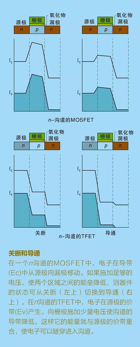 由于隧穿機制不是由能壘上的載流子流動所控制的,啟動TFET所要求的電壓擺幅可以比MOSFET小很多。只需施加足夠制造或移動一個使導帶和價帶交叉或不交叉的重疊的電壓足矣。(見插圖“關斷和導通”。)