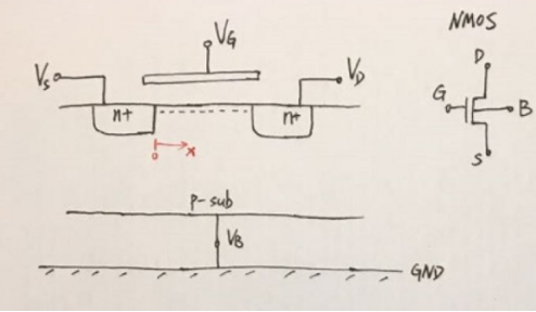 如下圖所示是一個NMOS的模型圖。MOS管是四端器件,包括源端(S)、漏端(D)、柵端(G)和襯底(B)。在標準CMOS工藝中,所有MOS管共用一個P型襯底,為了防止PN結正偏,P型襯底一般接GND。Vs、VD、VG均相對于襯底電壓定義。源極和漏極完全對稱,逐漸增加柵極電壓,在器件表面會出現反型層,對于NMOS來說,反型層由電子組成。反型層非常薄,其厚度可以近似忽略不計(Charge-Sheet ApproximaTIon),因而在分析中我們采用簡單的一維模型。在圖中以源極為原點,由源極引向漏極畫出x軸。
