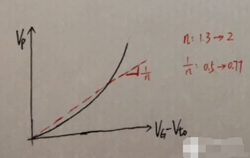 夾斷電壓和柵極電壓的關系如下圖所示,這種非線性是由反型層下方的勢壘電容Cdep的非線性造成的(在介紹MOS管電容模型時我們會詳細闡述)。為了簡化模型,通常用一條斜率為1/n的直線來近似,即Vp = (VG-Vt0)/n。在之后的計算中我們采用n = 1.5。注意:有的時候Vp與VG-Vt0的非線性關系會導致大信號偏置電路無法工作,具體地說,就是我們會推出n既大于1,又小于1,說明聯立不等式無解。這個例子我們會在之后介紹偏置電路的時候舉一個例子。
