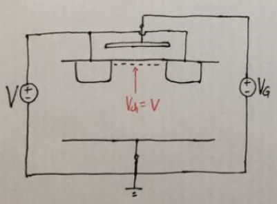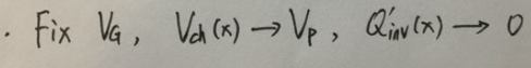 根據以上的近似,可以畫出Qinv’和Vch的關系。當Vch = Vp時,溝道被夾斷,電荷密度為0;當Vch = 0時,Qinv’ = Cox’*(VG – Vt0)。細心的童鞋們可能已經注意到,下圖的關系式與之前所列的平行班電容器的公式略有偏差,原因就是之前的公式是在忽略勢壘電容Cdep的效應,或者說在n = 1的條件下推出的。