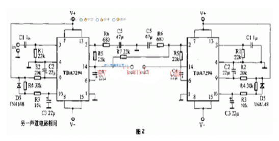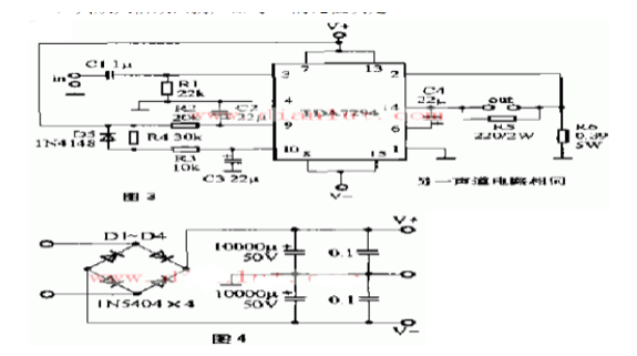 OCL電路圖見圖1,本電路是用兩片TDA7294組成的雙聲道70W?功放。外圍元件少,電路簡單,當電源電壓為土35V時,在8歐負載上可獲得70W的連續輸出功率。非常適合30平方米以下的環境放音。整流電路見圖4,如音箱阻抗小于8歐,電源電壓應相應降低。