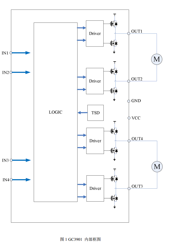 GC3901 具有 PWM(IN/IN)輸入接口,與行業標準器件兼容, 并具有過溫保護功能。GC3901 采用 DFN10 封裝。