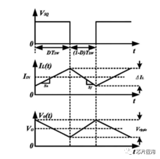 先大概了解了Boost的過程,再逐步考慮系統(tǒng)穩(wěn)定的條件。穩(wěn)態(tài)下,每個周期輸入端的能量剛好給輸出端。電感的電流在每個周期開始(Ton)和結(jié)束(Toff)時,大小剛好相同,輸出電壓在每個周期開始和結(jié)束時剛好相同。電感電流和輸出電壓的過程圖如下圖。D代表占空比,一個周期為Tsw。
