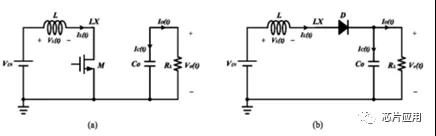 (b) 代表功率管M關(guān)斷,此時輸出電容Co需要能量補給,即電感能量的傳輸。二極管導通,電感電流通過二極管傳輸給負載,同時補充Co損失的電荷,為下個周期準備。